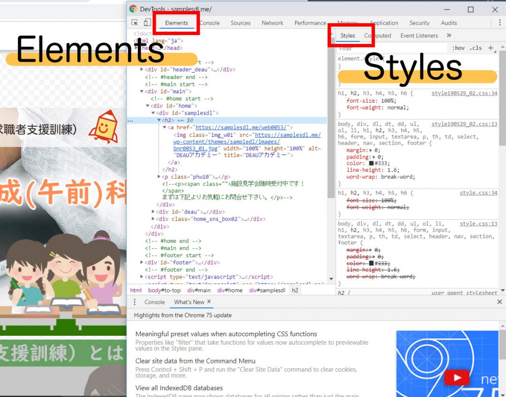 Elements「HTMLのコードが確認できる」